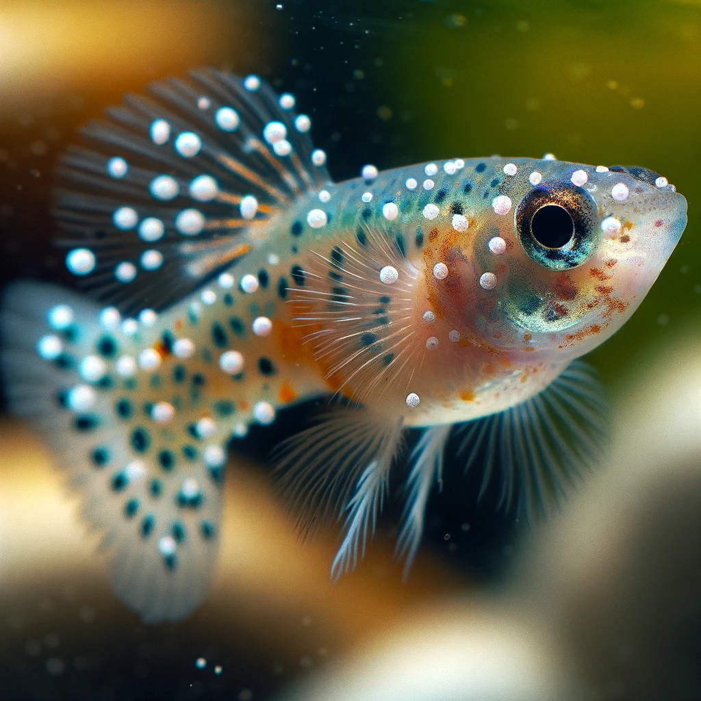 몸, 지느러미, 아가미에 작은 흰색 반점이 있음 물고기가 물체에 비비고 있는 모습(깜박임) 빠른 호흡