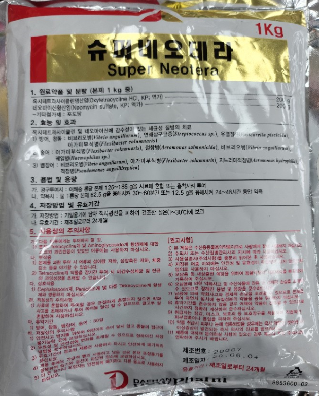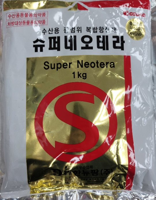 네오테라는 수산용 광범위 복합 항생제로 흔히 말하는 OTC 성분이 포함된 제품이다.